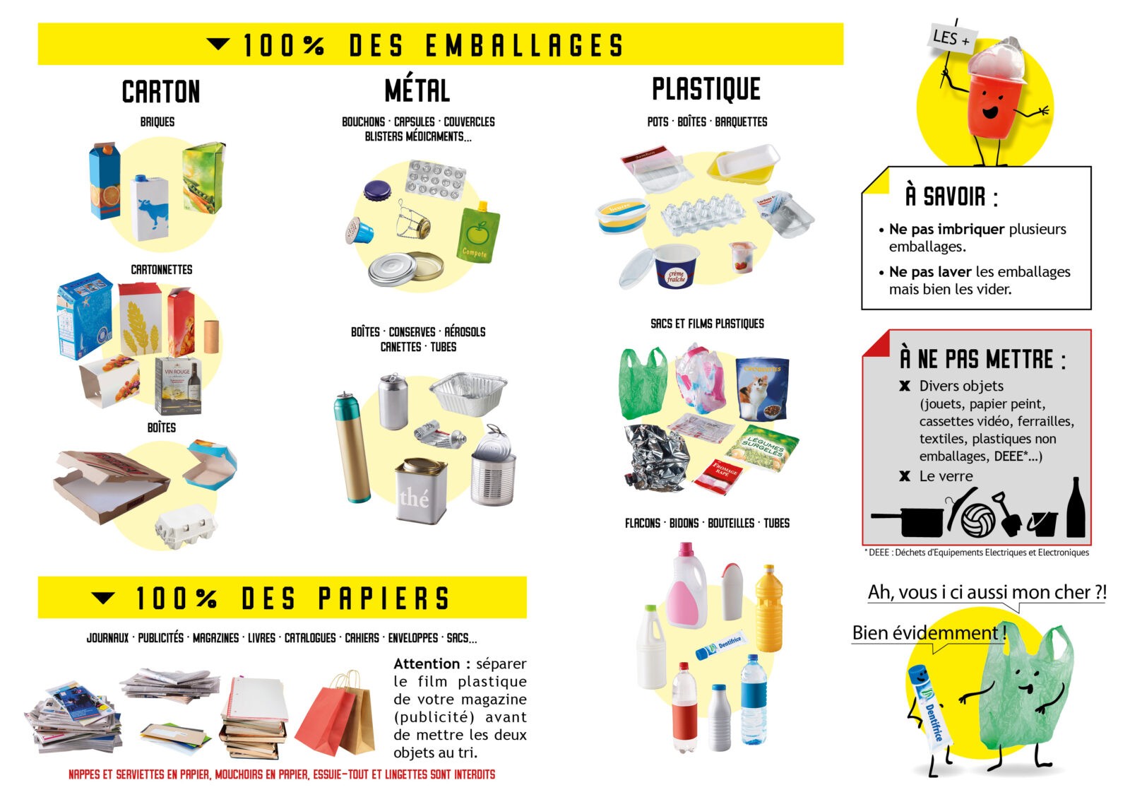 Un seul message, tous les emballages et les papiers vont dans la poubelle jaune, en vrac et sans sac.